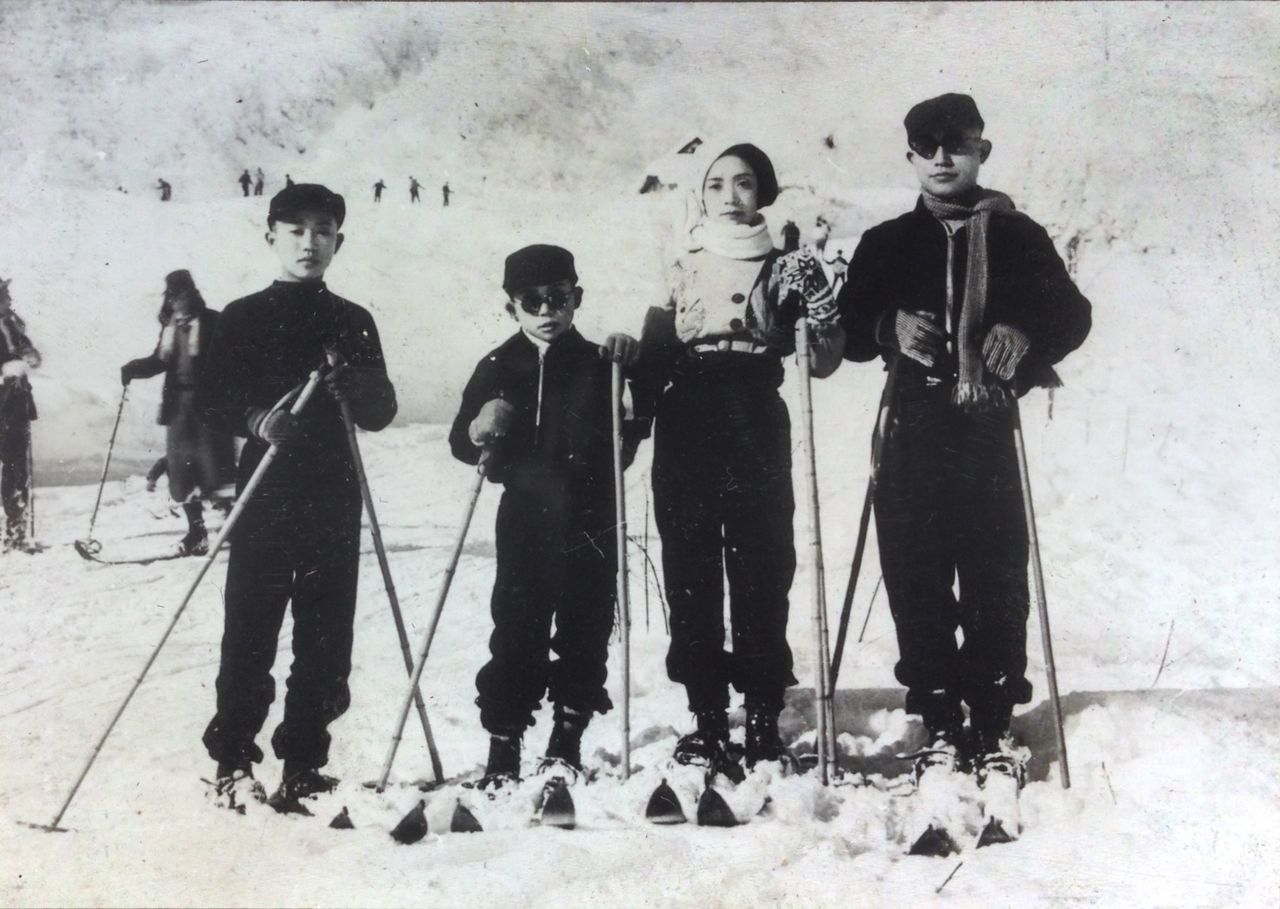 (祖父母一家。右から祖父、祖母、父、叔父。冬になると大山でスキーを楽しんだとか)