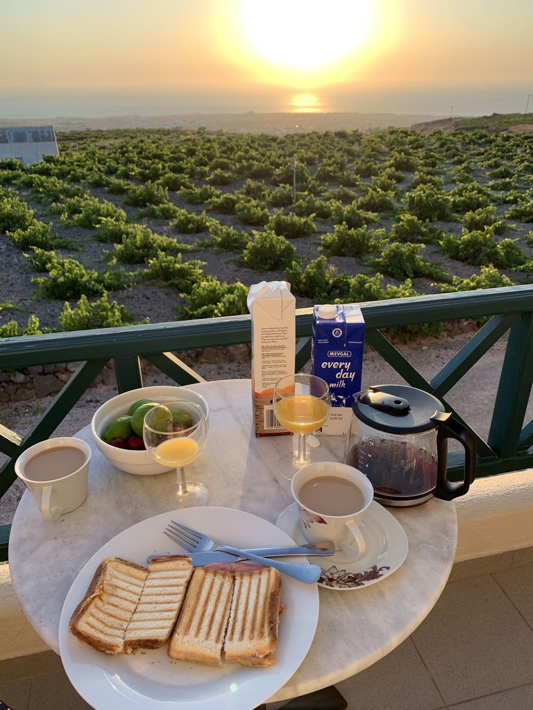 (エーゲ海にのぼる朝日に活力をもらったギリシャ、サントリーニ島の朝食)
